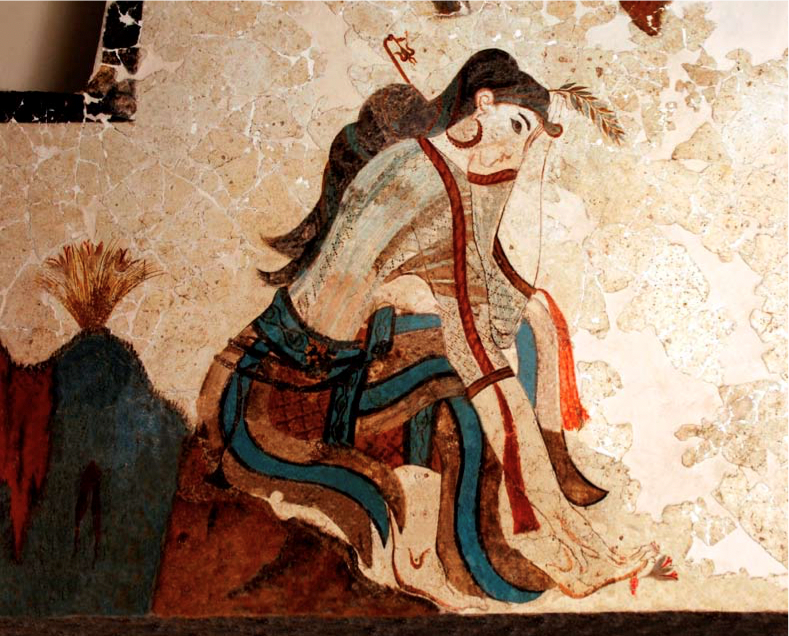 It is still unknown precisely where saffron was first domesticated. Crete, Central Asia, Iran, even Kashmir, have been speculated places of origin. However, botanical research suggests its origin being Greece and Crete, and the oldest evidence of saffron being used is depicted in Minoan society. Earthenware pots from the Minoans show the crocus’s images. Frescoes in palaces on Crete depict a goddess offered saffron as a sacrifice, women and monkeys harvesting the crocus and a woman coloring her lips using saffron. The image shown here depicts a woman using saffron to treat her bleeding foot. Experts believe saffron played a vital role in the Minoan religion. Saffron played a role in many other religions. In the Hebrew Bible, saffron is hailed for its sweet smell, alongside pomegranates and cinnamon. In Persia, saffron was cultivated in the 10th century BCE. It was used as a ritual offering to deities, as well as a dye, perfume, and medicine.